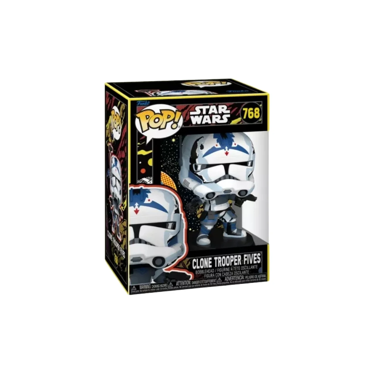 Funko Clone trooper fives. Si hay un clon que ha dejado huella en la historia de Star Wars: The Clone Wars, ese es Fives. El Funko POP! Clone Trooper Fives (Retro) – Star Wars #768 rinde homenaje a este personaje valiente, leal y rebelde, que desafió el sistema para hacer lo correcto. Su historia conmovedora lo convirtió en uno de los favoritos de los fans, y esta figura llega como una versión especial con estética retro para celebrar su memoria.