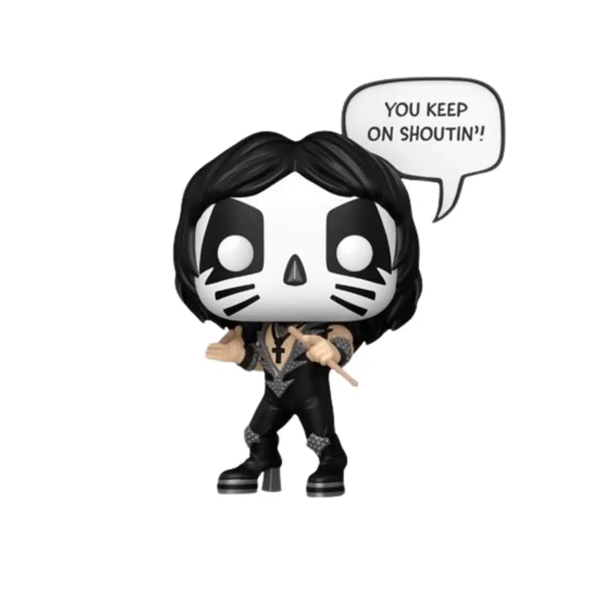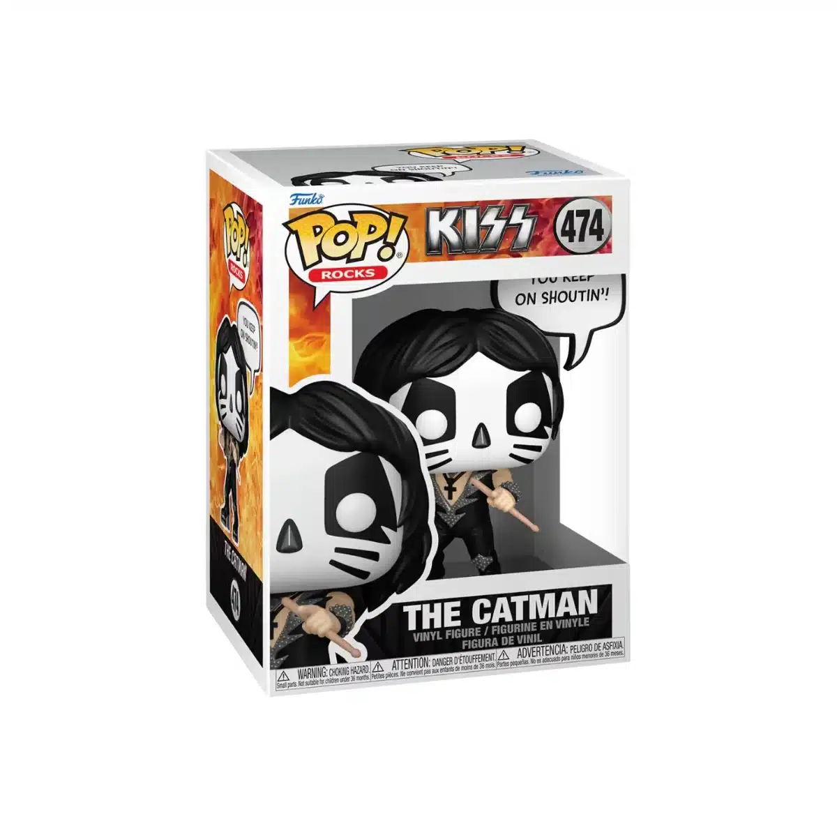 Cada detalle de esta figura está cuidadosamente diseñado: desde el maquillaje felino hasta el vestuario lleno de tachuelas y cuero, típico de los escenarios de Kiss durante sus giras más míticas. Además, The Catman sostiene sus baquetas, preparado para desatar el ritmo que acompañó a éxitos inmortales como Beth o Black Diamond. Es mucho más que una figura; es un pedazo de la historia del rock llevado a formato Funko Pop!, ideal para los fans de la música y del coleccionismo.